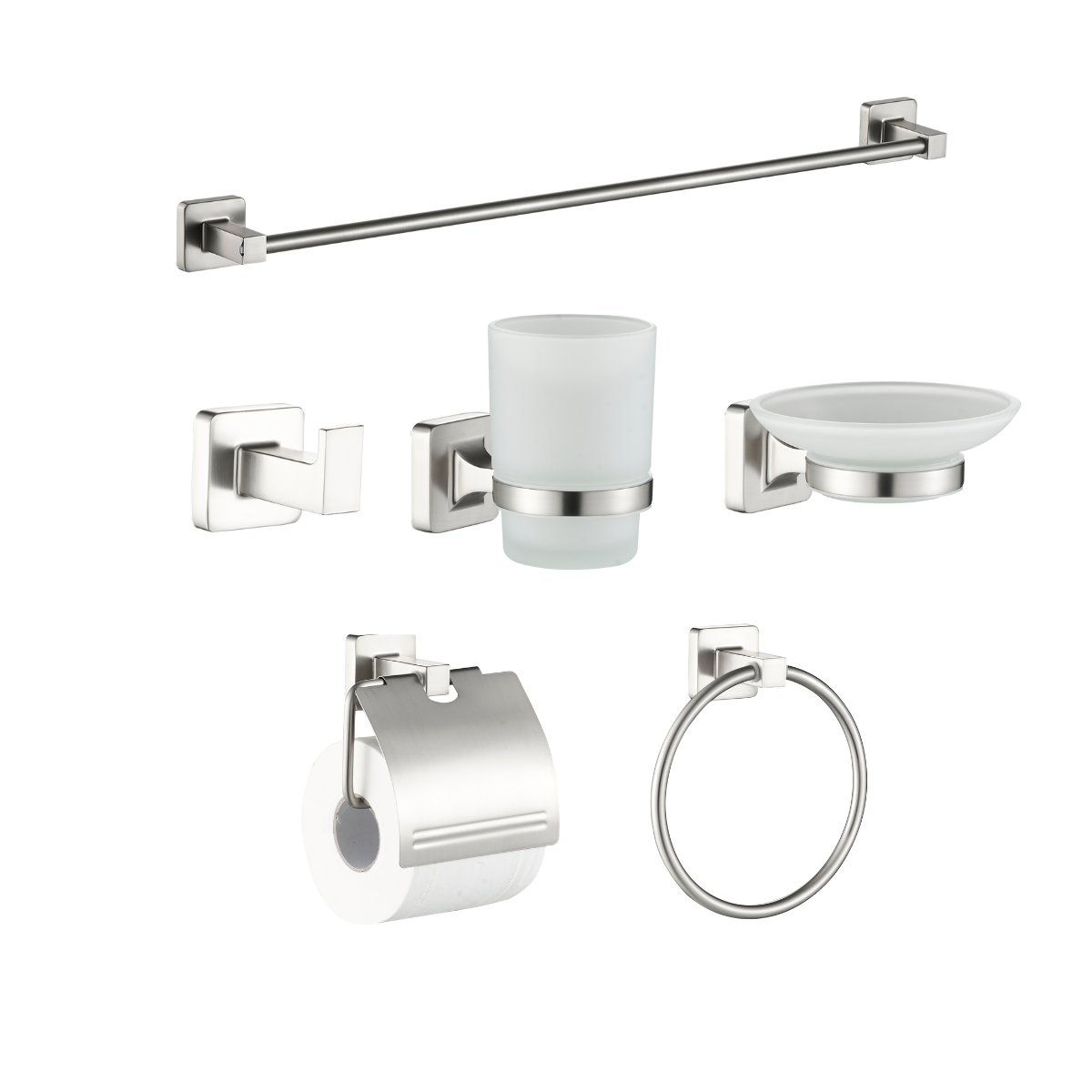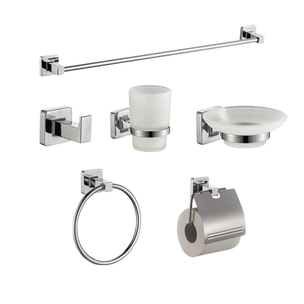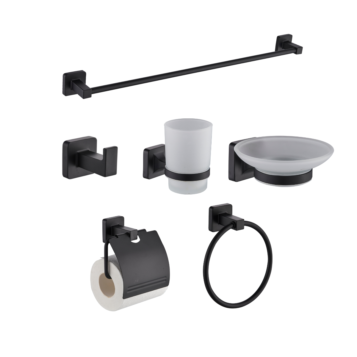 Aro para toalla, Percha de bata, Porta papel de baño, Portavaso, Jabonera y toallero de barra