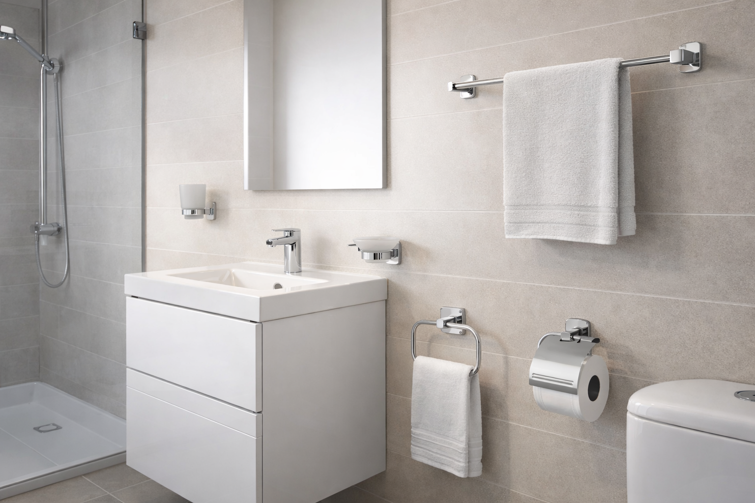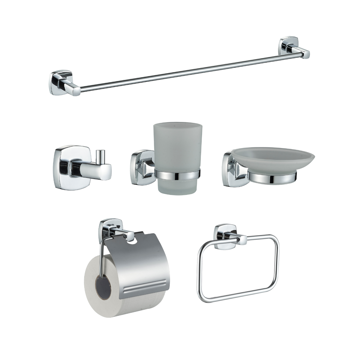 Kit incluyeAro para toalla, Percha de bata, Porta papel de baño, Portavaso, Jabonera y toallero de barra